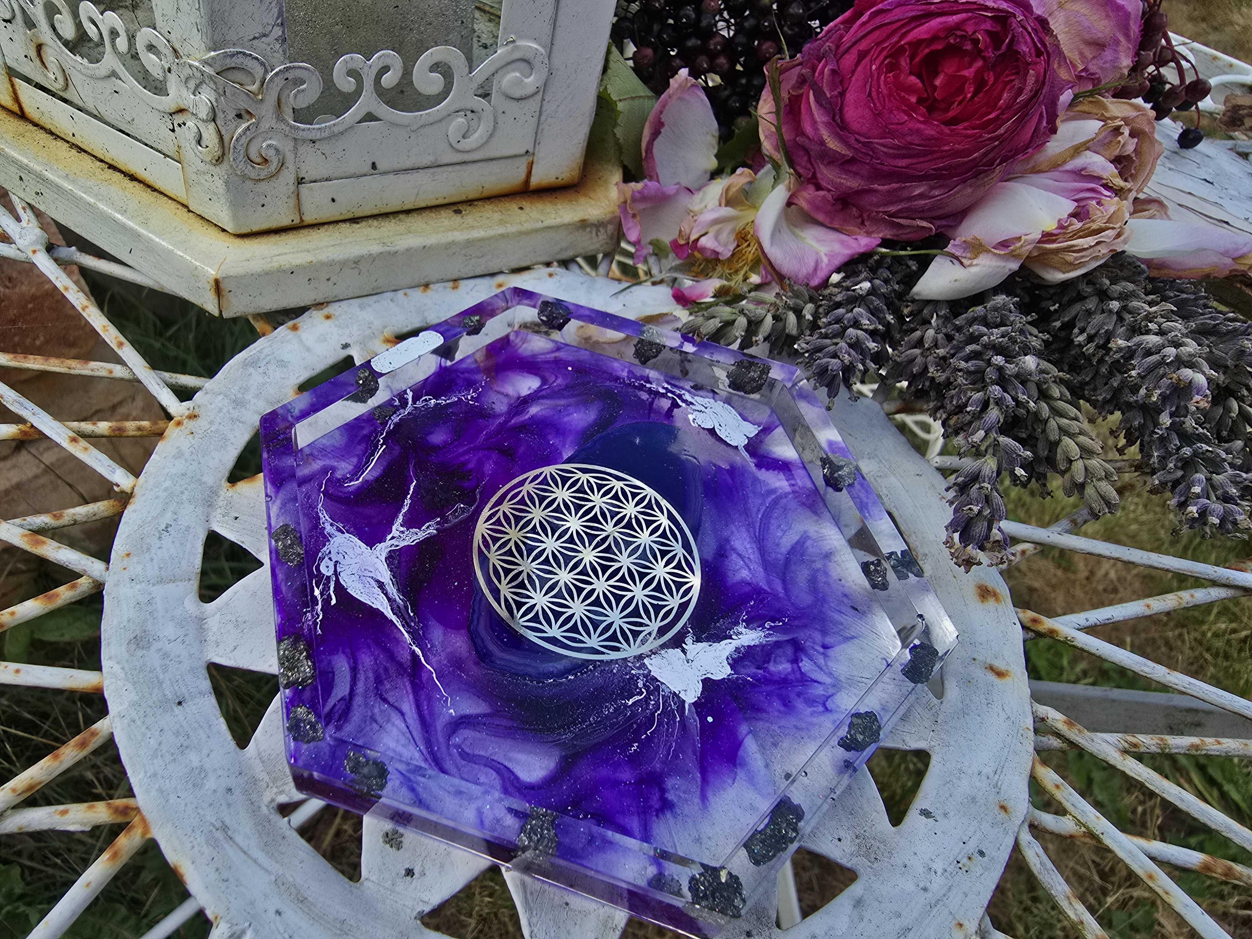 Ein wunderschöner Untersetzer, der mit seiner faszinierenden Farbgebung ein richtiger Augenmagnet ist. In liebevoller Handarbeit hergestellt schmückt er dein Zuhause. Ob als Untersetzer für einen Wasserkrug, ein Glas oder von unten ausgeleuchtet als eine behagliche Lichtquelle. Die darin eingearbeitete Achatscheibe soll unter anderem das logisch rationale Denken fördern. Umrandet von kleinen Pyriten wird der Untersetzer zu einem Accessoire, das die Ursachen bestimmter Situationen beleuchtet und damit zu den notwendigen Veränderungen verhilft. Das Symbol für die Blume des Lebens unterstützt hier noch zusätzlich die Wirkung der enthaltenen Steine.