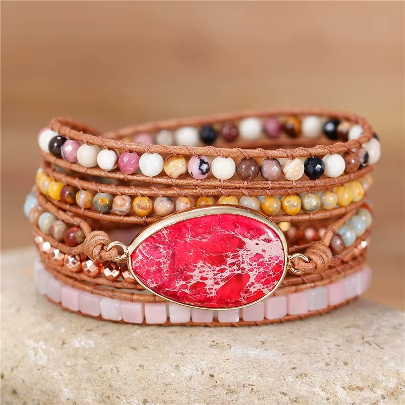 Dieses handgefertigte Wickelarmband verbindet erdige Naturtöne mit einem intensiv roten Jaspis im Zentrum – ein Stein, der für Stabilität, Mut und innere Stärke steht.